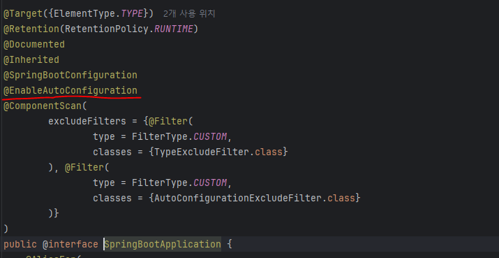 그 역할은 바로 @EnableAutoConfiguration 어노테이션에서 수행을 해준다. 해당 어노테이션은 외부 라이브러리의 자동 구성 클래스를 탐지하고 등록해주는 역할을 수행해준다.