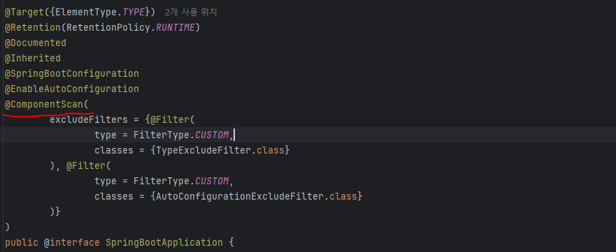 다음과 같이 main() 메서드가 포함된 클래스에 선언된 @SpringBootApplication 어노테이션 내부의 @ComponentScan 어노테이션이 자동으로 컴포넌트 스캔기능을 수행해준다. 즉 개발자가 컴포넌트 스캔 설정 작업을 직접할 필요가 없다.