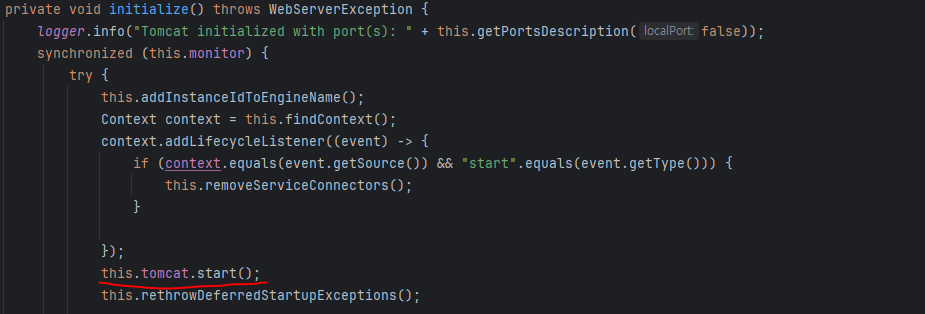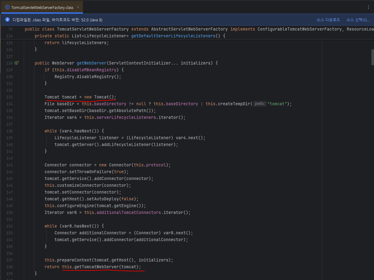 그리고 this.getTomcatWebServer 메서드를 끝까지 따라가보면 톰캣을 실행하는 로직이 구현되어있다.