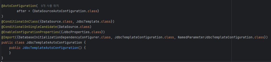 그리고 이러한 자동 구성 클래스로 선언된 클래스 내부에 선언된 빈들은 스프링부트 구동시 모두 자동으로 ioc 컨테이너에 등록되게된다. 이를 통해 우리는 jdbcTemplate 를 직접 빈 선언하지 않고도 해당 클래스를 주입해서 사용할 수 있었던것이다.