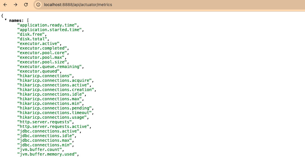 2)/actuator/metrics: JVM프로세스 CPU 사용량, HTTP 요청 횟수등의 다양한 메트릭을 제공
