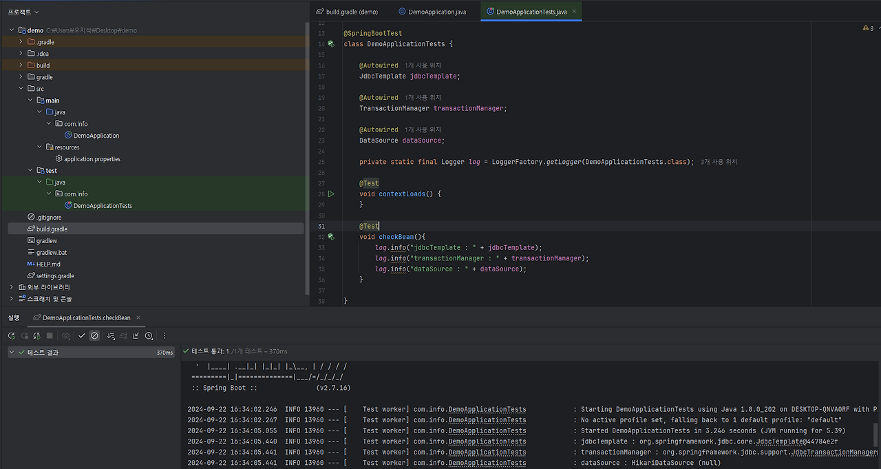 다음과 같이 JdbcTemplate, TransactionManager, DataSource 를 주입한 후 객체가 생성됐는지 확인하는 테스트 코드를 작성했다.