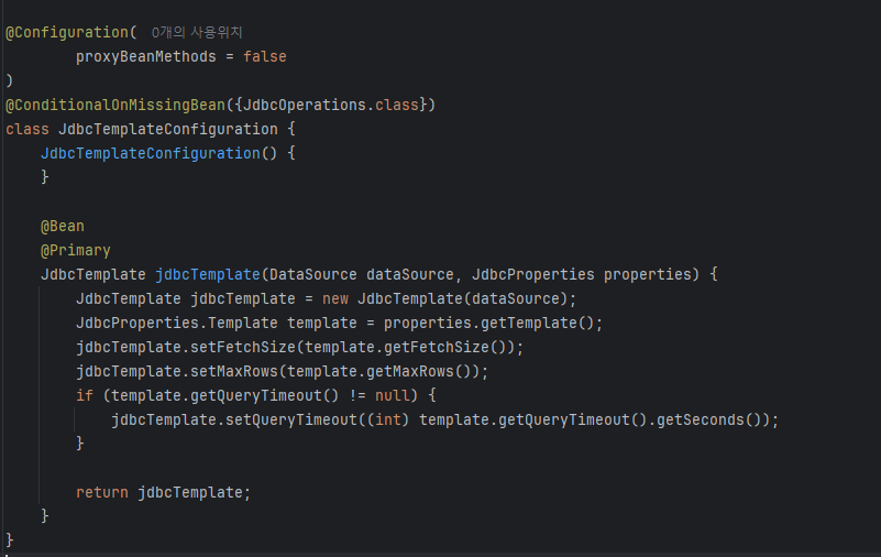 import 에 기재되어있던 JdbcTemplateConfiguration 클래스를 살펴보니 configuration + bean 조합으로 빈을 선언해둔걸 확인할 수 있다.